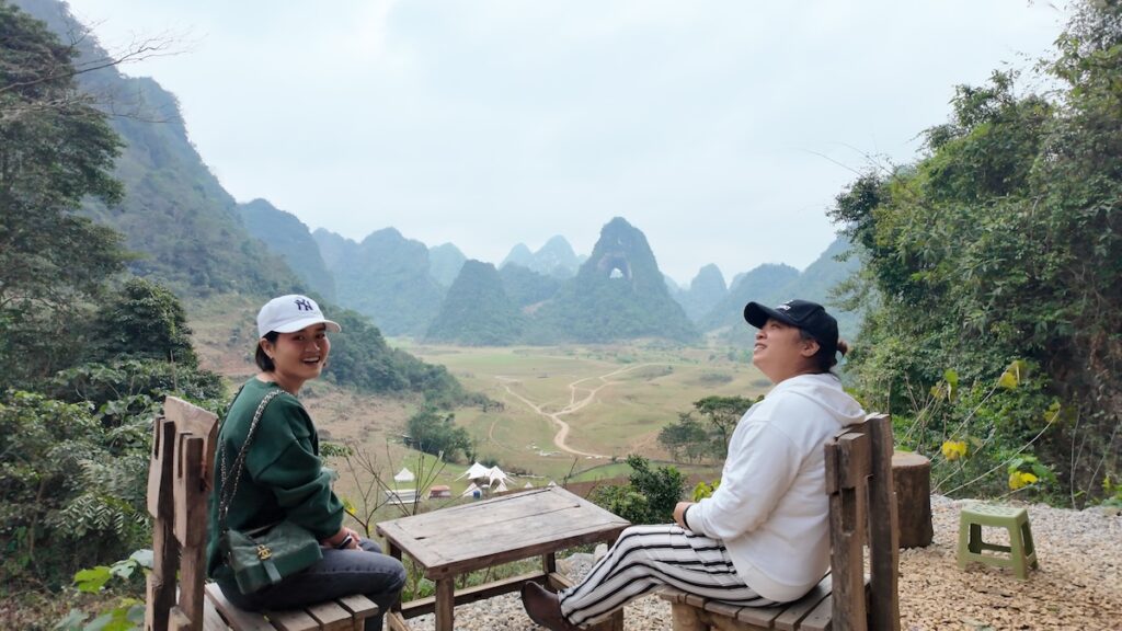 Ở Tà Xùa hay Hà Giang, khi bạn đi dọc những triền núi, nhìn ra xa là núi non trùng trùng điệp điệp hết lớp này đến lớp khác. Còn ở Cao Bằng, núi non không cố gắng thể hiện với bạn là nó trung điệp thế nào, nó chỉ đứng từ xa bao bọc lấy bạn, bình lặng đứng yên cho bạn thoải mái đi giữa những thung lũng rộng lớn, hai bên là cánh đồng lúa hay ruộng bậc thang. Mình chỉ việc hạ kính xe, nhoài đầu ra ngắm nhìn sự hoang sơ núi đồi, cánh đồng, làng mạc và những cái cây như đã hàng trăm năm tuổi. Ở Cao Bằng không cần cố gắng để đến điểm nay điểm kia tìm kiếm cảnh đẹp vì cảnh đẹp ở ngay trước mắt, ngay lúc này, trong mọi khung cảnh rồi.