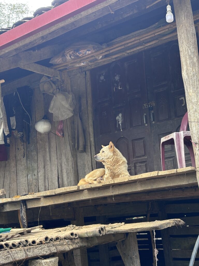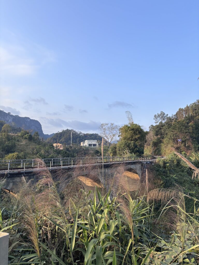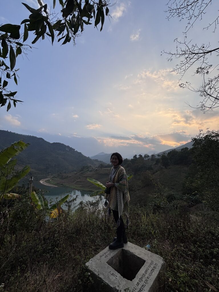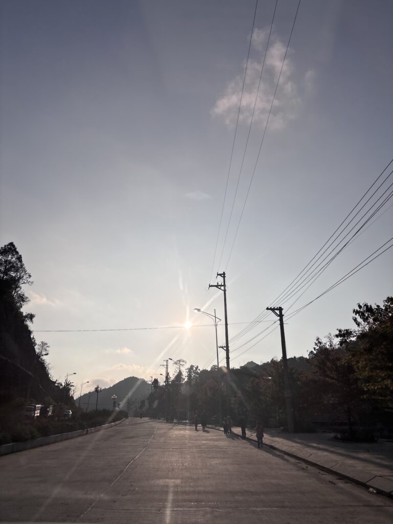 Cơ duyên nào để mấy bà cô từ miền Nam lặn lội ra đến con đường biên giới này trong một buổi chiều hoàng hôn vàng rực, bên kia sông là Trung Quốc. Mình cứ đi mãi trên con đường song song với biên giới, đi giữa rừng, hai bên là vách núi dựng đứng, con đường chỉ có ta với ta. Từng tia nắng nỗ lực đến phút cuối, níu kéo chút hiện diện nhưng rồi phải chịu thua, nhường chỗ cho bóng tối sâu thẳm chốn rừng thiêng nước độc. Thì ra buổi chiều tĩnh lặng miền biên viễn là đây.